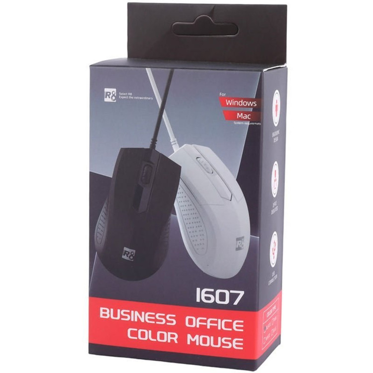 ماوس R8 مدل 1607 از طراحی ارگونومیک بهره میبرد که برای استفاده طولانیمدت راحتی مناسبی را فراهم میکند. ابعاد این ماوس (110 × 64 × 40 میلیمتر) و وزن سبک (59 گرم) باعث میشود که به راحتی در دست جای گیرد و گزینهای ایدهآل برای کاربرانی باشد که به دنبال یک ماوس سبک و جمعوجور هستند. جنس بدنه آن از پلاستیک مقاوم ساخته شده است که در برابر ضربه و فشار دوام مناسبی دارد. این ماوس همچنین به یک طراحی ساده و کلاسیک مجهز شده که ظاهر جذابی به آن بخشیده است.