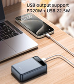 یکی از ویژگیهای برجسته این پاوربانک، پشتیبانی از فناوری شارژ سریع QC 3.0 و PD است 🚀. توان خروجی این دستگاه از طریق پورت USB-A تا 22.5 وات و از طریق پورت Type-C تا 20 وات میرسد. همچنین، قابلیت شارژ بیسیم با توان 15 وات، امکان شارژ دستگاههای مجهز به فناوری وایرلس را بدون نیاز به کابل فراهم میکند 📡. این ویژگیها زمان شارژ دستگاهها را بهطور قابلتوجهی کاهش میدهند.