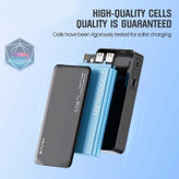 بدنه این پاوربانک از مواد مقاوم ABS ساخته شده است که در برابر ضربه و خراش مقاوم است 💪. طراحی باریک و سبک آن، حمل آسان و استفاده راحت را تضمین میکند. همچنین، وجود نمایشگر LED برای نمایش میزان شارژ باقیمانده، از ویژگیهای برجسته این محصول است 📊.